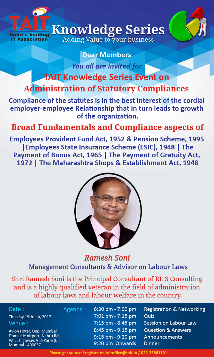 'TAIT Knowledge Series’ Workshop on the theme “Effective Administration of Statutory Compliances” on 19th Jan 2017