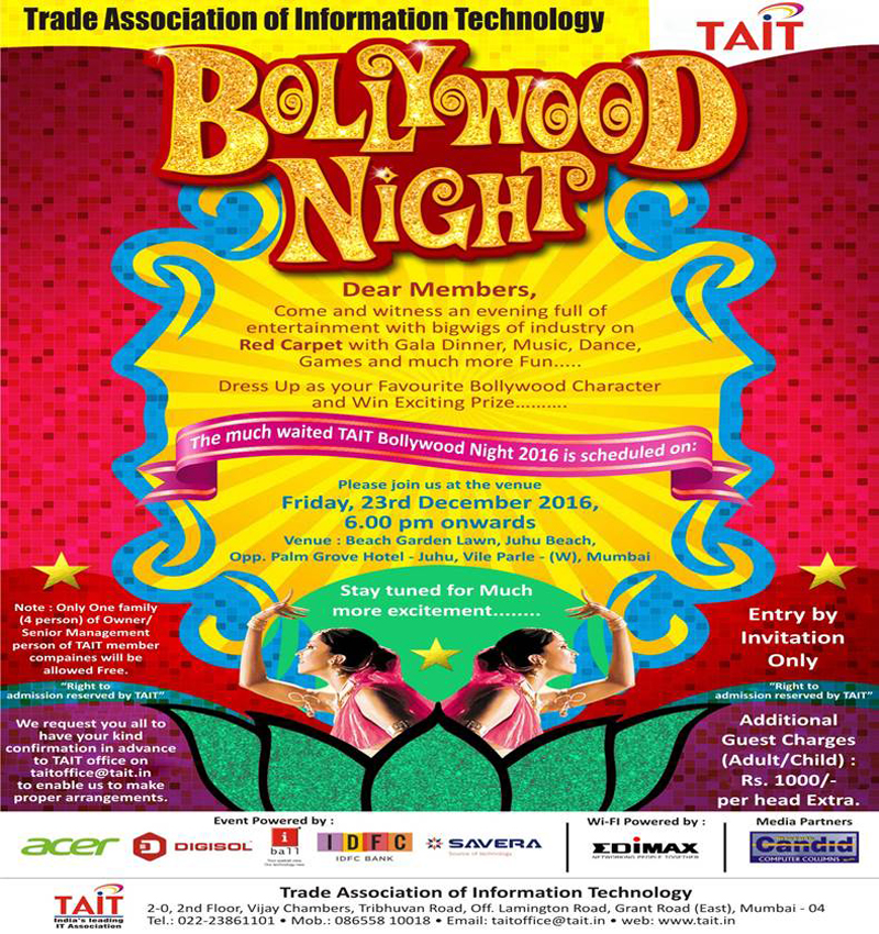 The event was conceptualised by Rahul Zaveri, Manish Kapasi and assisted by Directors Samir Mehta, Magan Gangani and Kripashankar Chaube. The theme was Bollywood Nite and huge cutouts of cult personalities of the Cine world were all around the venue where the stars of the night were the esteemed TAIT members and their loved ones. The excellent backdrops provided photoops and selfie moments which were lapped up by the guests.