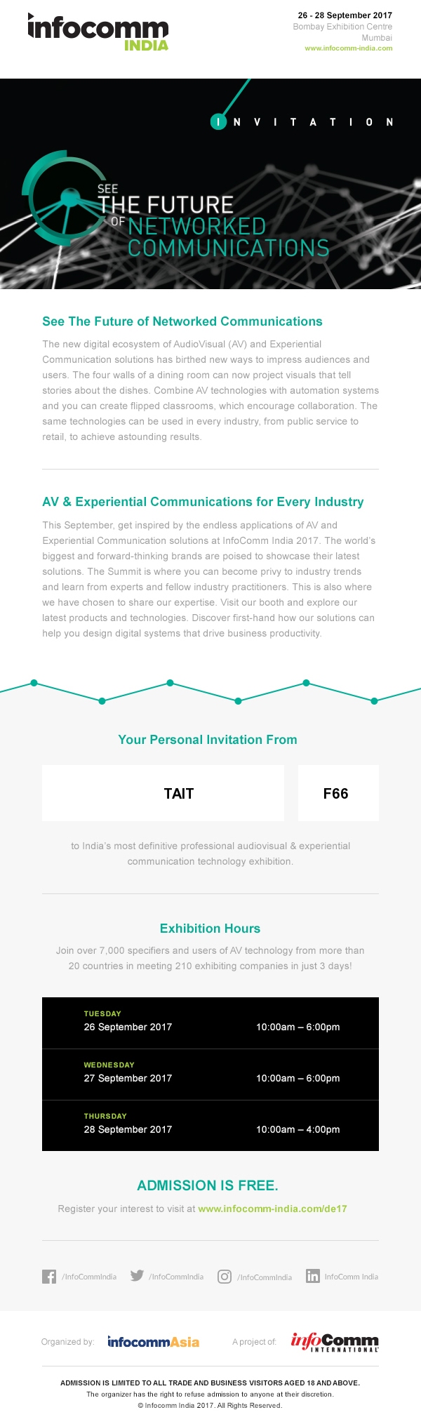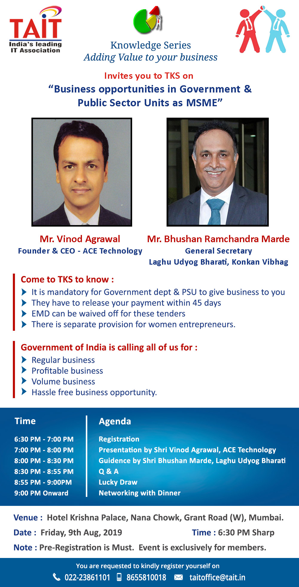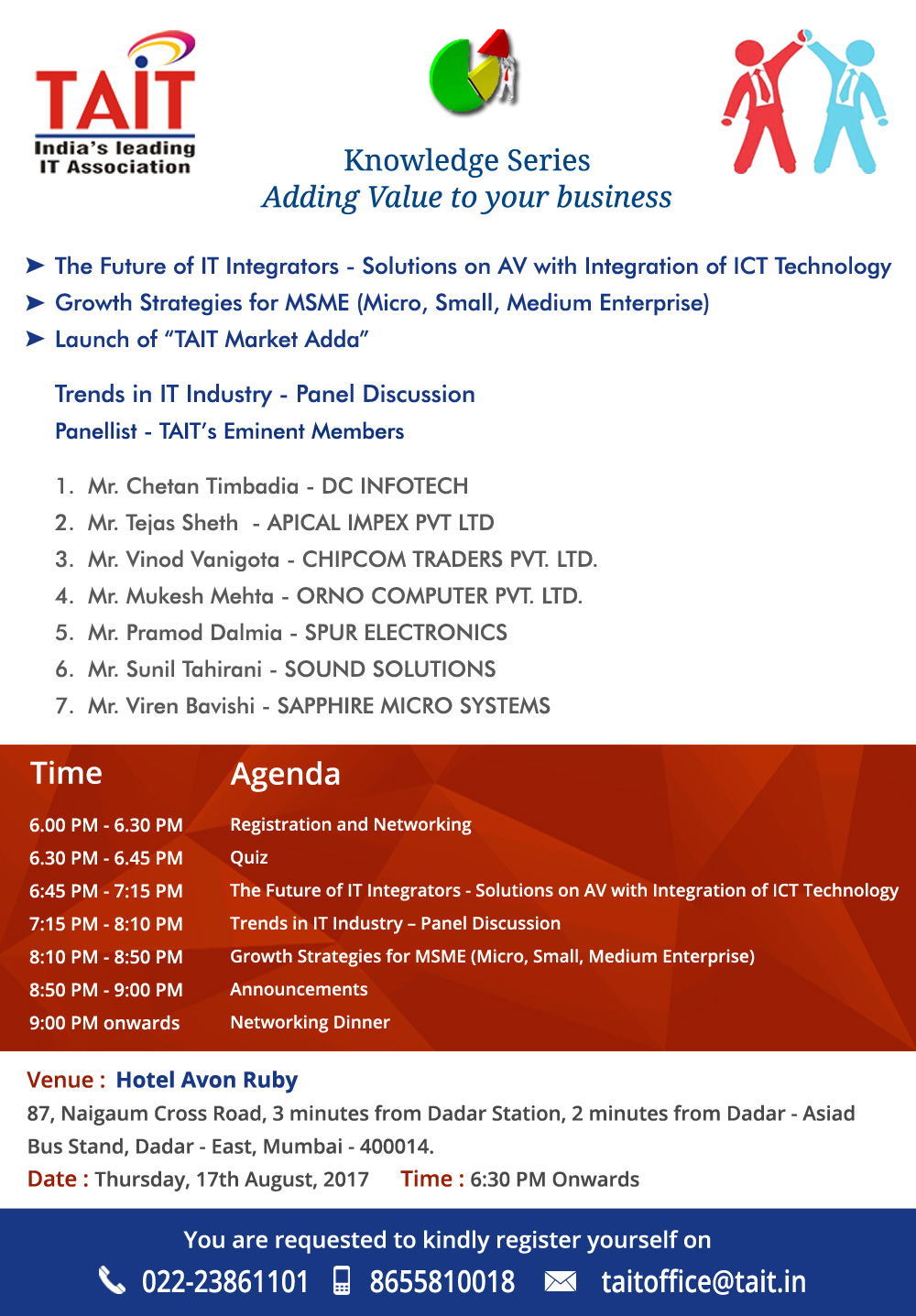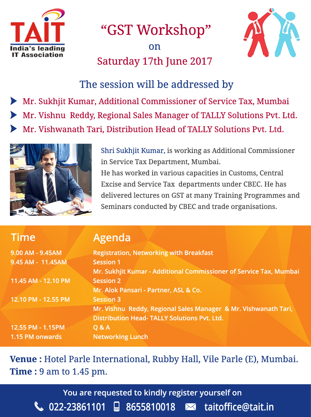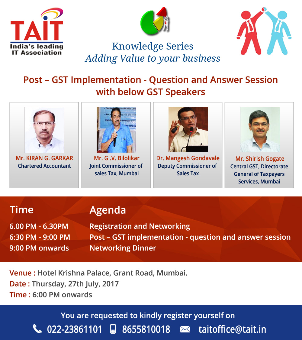 Event Name Event Date TAIT Knowledge Series - Check Photos 21st Nov, 2017 InfoComm India 2017 26th-28th September, 2017 TAIT Knowledge Series - Check Deatils 17th August, 2017 TAIT Knowledge Series - Check Photos 27th July, 2017 TAIT Knowledge Series - Check Photos 22th June, 2017 TAIT Workshop on GST - Check Photos 17th June, 2017 TAIT Knowledge Series on GST 13th April, 2017 TAIT Paathshaala, on G Suit 4th March, 2017 TAIT Knowledge Series on Labour Law 19th Jan, 2017