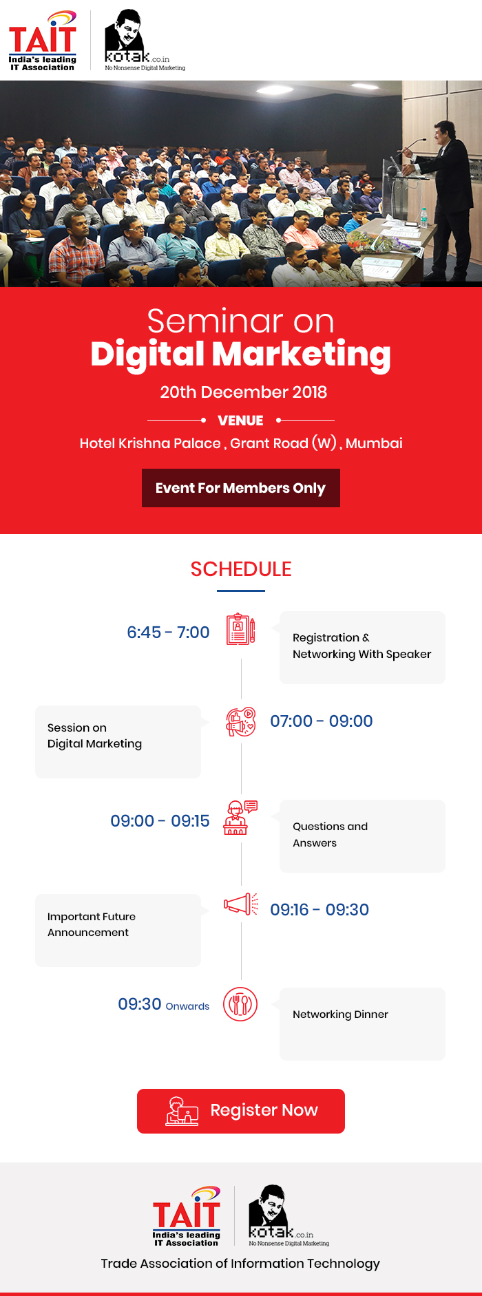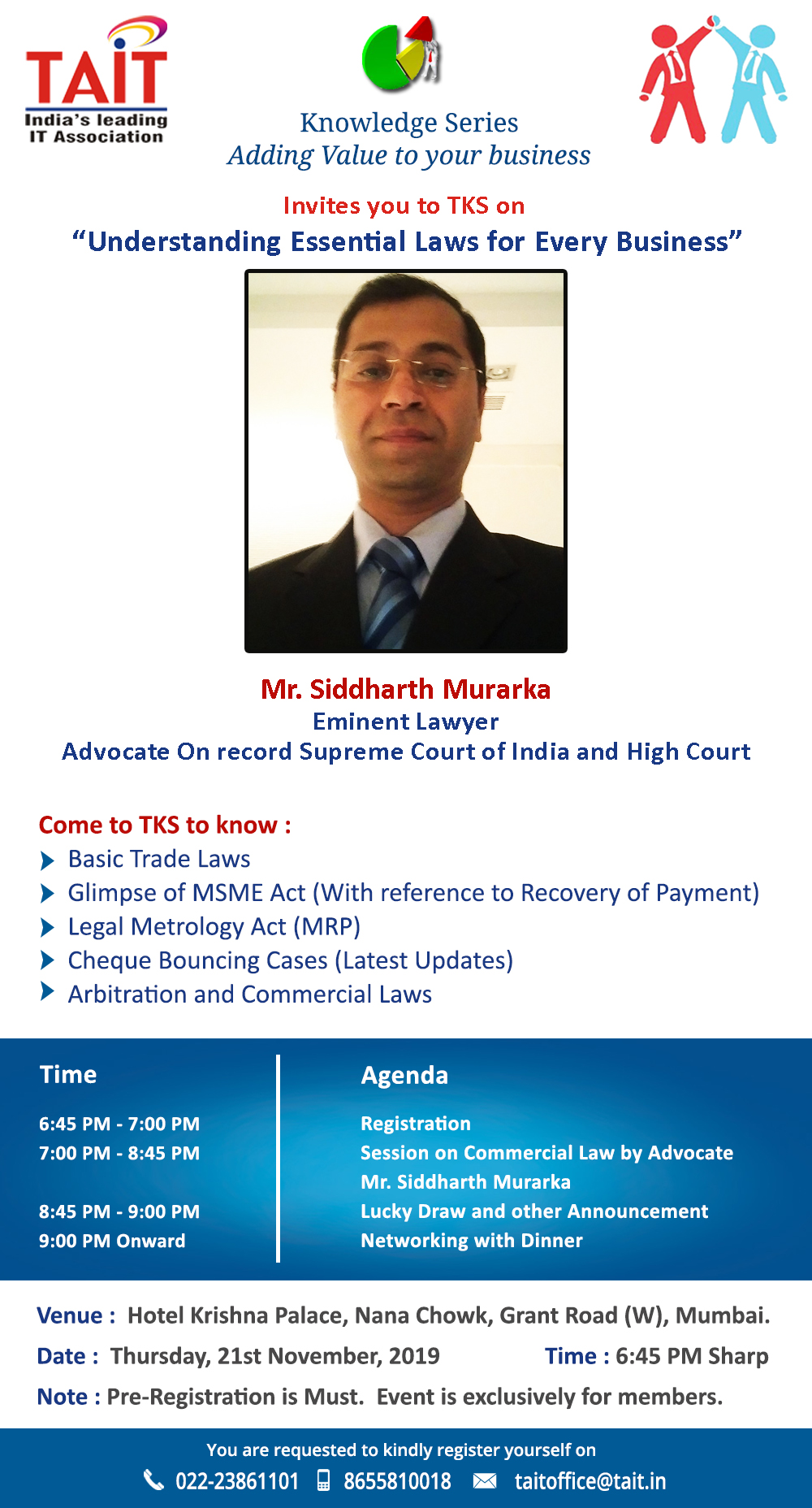 Event Name Event Date TAIT Knowledge Series, on Ethical Hacking & Cyber Security 18th November 2016 TAIT Paathshaala, on Tally 22nd October 2016 TAIT Paathshaala, on Data Recovery 19th July 2016 TAIT Knowledge Series, on Financial Life Planning & Stress Management 14th July 2016 TAIT Knowledge Series, on IT Traders to emulate ‘Dabbawala’ Model of Service Excellence 22th June 2016 TAIT Knowledge Series, Workshop on Twin issues Of Cheque Dishonour Disputes Resolution And New provisions Of Income/Direct Tax Rules 20th May 2016 TAIT Conducts knowledge series on Managing Team Tasks 26th April 2016 TAIT Pathshala workshop on TALLY 12th March 2016 TAIT Paathshaala Launch (Office Suites & Spreadsheet Productivity) 30th Jan 2016 TAIT Knowledge Series Cyber Security 12th Jan 2016