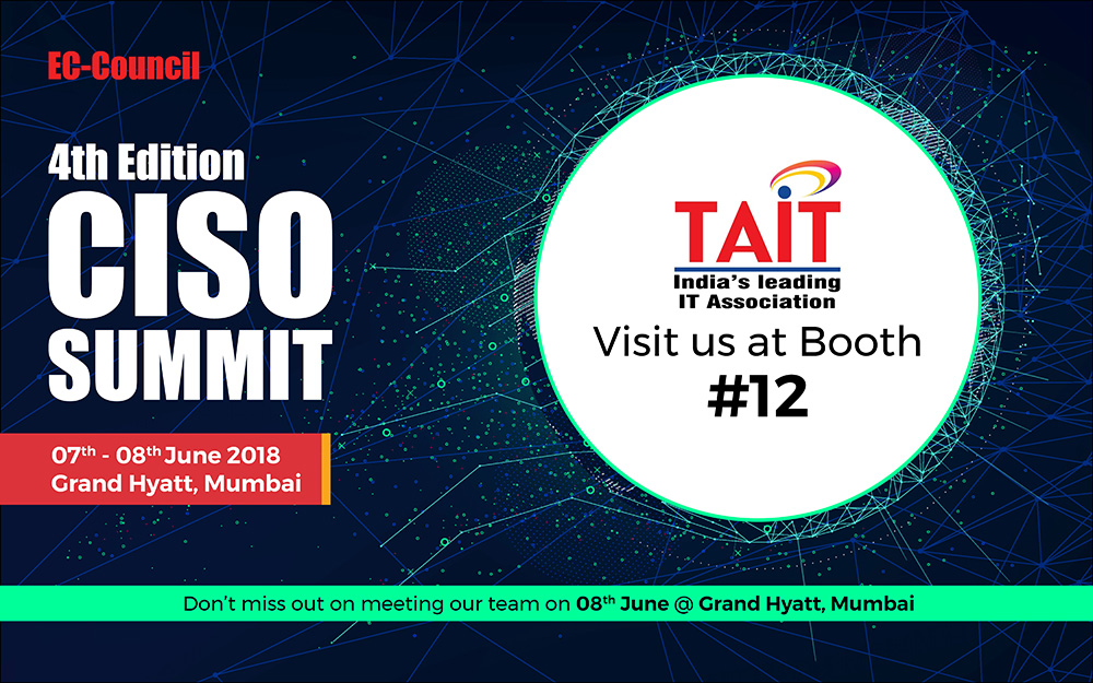 Event Name Event Date TAIT Knowledge Series 2018 - Check Photos - News 20th Dec 2018 TAIT Knowledge Series 2018 - Check Photos - Read More 21st Nov, 2018 Smart Cards Expo 2018 30th-31th oct & 1st Nov, 2018 TAIT Market Adda - Check Photos 30th oct, 2018 TAIT Knowledge Series 2018 - Check Photos 19th Sept 2018 Minutes of TAIT Open Forum - Check Photos 18th June, 2018 ReTechCon 2018 12-13th June, 2018 CISO Summit 2018 08th June, 2018 IT-SA India 2018 24th-25th May, 2018 TAIT Knowledge Series 11th May, 2018 TAIT Knowledge Series 24th Jan, 2018