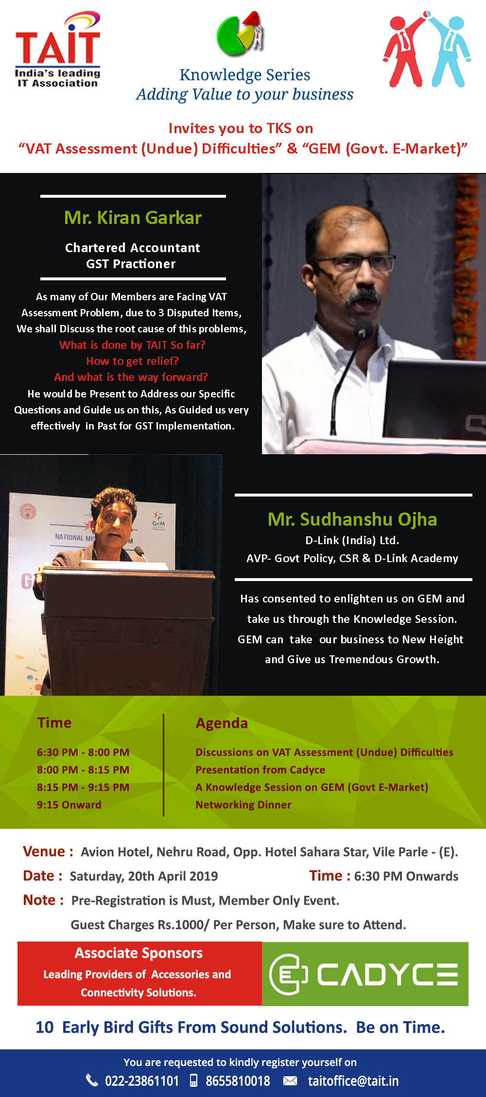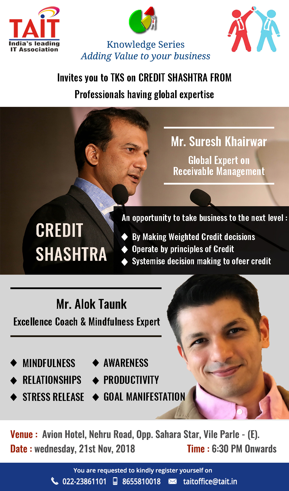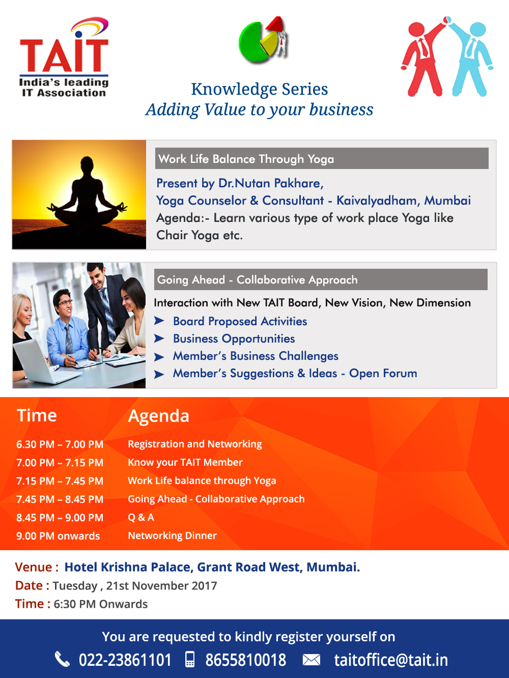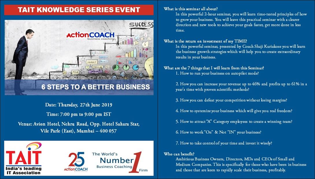 Event Name Event Date TAIT Knowledge Series - Check Photos 21st Nov, 2017 InfoComm India 2017 26th-28th September, 2017 TAIT Knowledge Series - Check Deatils 17th August, 2017 TAIT Knowledge Series - Check Photos 27th July, 2017 TAIT Knowledge Series - Check Photos 22th June, 2017 TAIT Workshop on GST - Check Photos 17th June, 2017 TAIT Knowledge Series on GST 13th April, 2017 TAIT Paathshaala, on G Suit 4th March, 2017 TAIT Knowledge Series on Labour Law 19th Jan, 2017