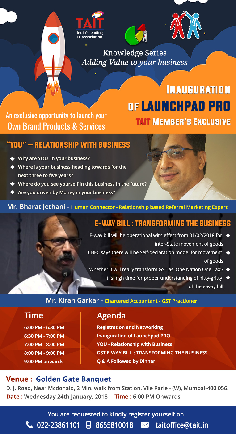 Event Name Event Date TAIT Knowledge Series, on Ethical Hacking & Cyber Security 18th November 2016 TAIT Paathshaala, on Tally 22nd October 2016 TAIT Paathshaala, on Data Recovery 19th July 2016 TAIT Knowledge Series, on Financial Life Planning & Stress Management 14th July 2016 TAIT Knowledge Series, on IT Traders to emulate ‘Dabbawala’ Model of Service Excellence 22th June 2016 TAIT Knowledge Series, Workshop on Twin issues Of Cheque Dishonour Disputes Resolution And New provisions Of Income/Direct Tax Rules 20th May 2016 TAIT Conducts knowledge series on Managing Team Tasks 26th April 2016 TAIT Pathshala workshop on TALLY 12th March 2016 TAIT Paathshaala Launch (Office Suites & Spreadsheet Productivity) 30th Jan 2016 TAIT Knowledge Series Cyber Security 12th Jan 2016